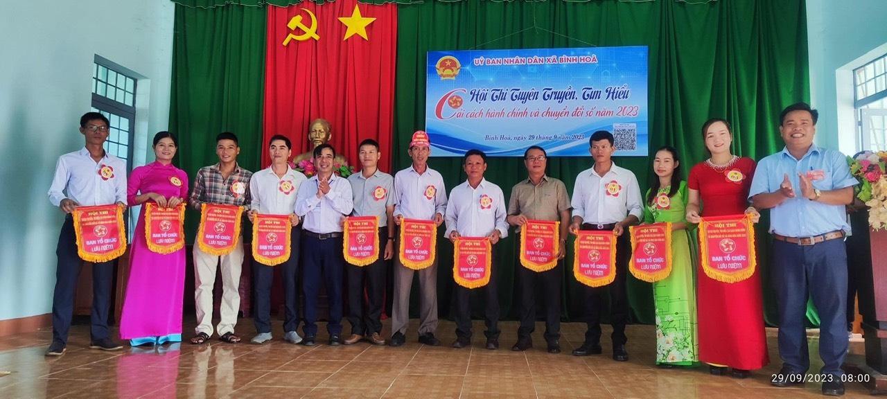 Sáng ngày 29/9/2023, UBND xã Bình Hòa tổ chức Hội thi tuyên truyền, tìm hiểu cải cách hành chính Nhà nước và chuyển đổi số năm 2023, về tham dự hội thi có Ông Nguyễn Văn Mạnh, PCT UBND xã, Phó Trưởng Ban tổ chức hội thi; Ông Trần Đăng Thiện, PCT UBND xã; Ông Trương Văn Toàn, CT MTTQVN xã; Trưởng các ban ngành đoàn thể xã; Gội thi gồm 11 đội thi ( 07 thôn và 4 trường học) 33 thí sinh của 11 đội tham gia hội thi và hơn 200 khán giả về tham dự cổ vũ cho các đội thi.